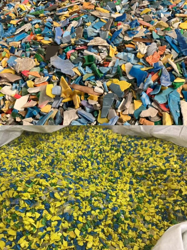 右の写真:上記引き取りした樹脂を破砕、選別、洗浄しペレット加工した状態です。このようなペレット製品は様々な業者に用途に合わせて資源循環いたします。