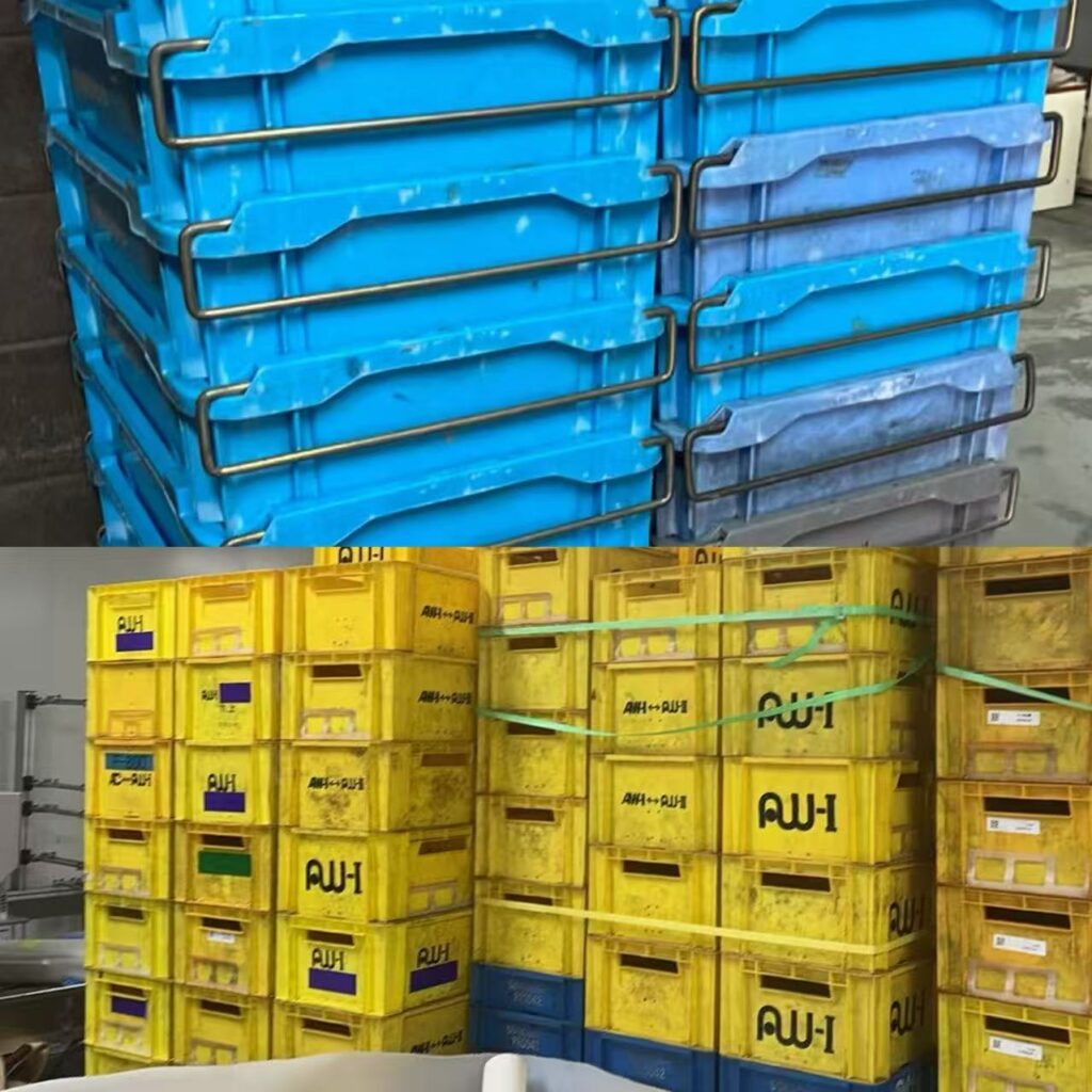 左の写真:PP箱引き取り時の写真です。写真のように金属が付属している場合も破砕機で破砕し選別後、それぞれリサイクル工程に移ります。